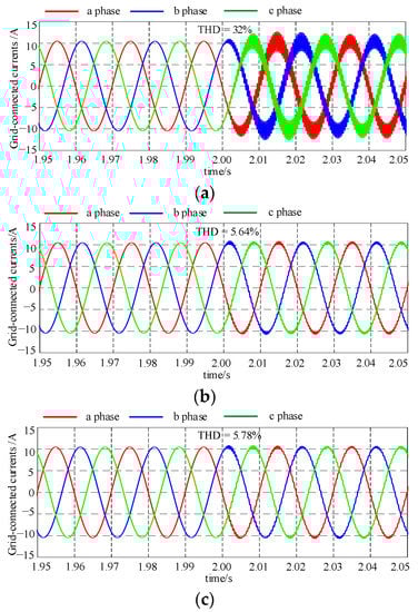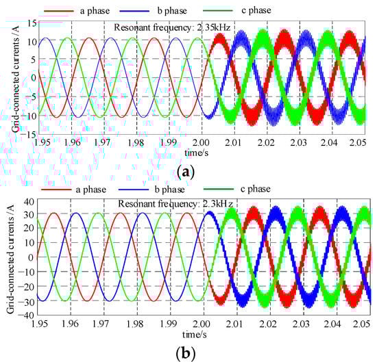 Furthermore, the resonance characteristics analysis of a VSG and its cluster in Section 4.1 was verified. According to the above analysis, the resonant frequency of a VSG without an inner-loop controller is determined by the resonant frequency of the LCL-type filter. According to the parameters in Table 1, the resonant frequency of the LCL-type filter was 2.3 kHz. To intuitively reveal the resonance characteristics, 2.3 kHz, 2.1 kHz, and 2.5 kHz harmonic components were added to the grid voltage respectively after 2 s, with 1% of harmonic voltage. The simulation results were obtained, as shown in Figure 16. This indicates that the system in Figure 15a was excited by a harmonic excitation source, resulting in resonance and serious distortion of the output currents. Interestingly, in other harmonic frequency bands, the current distortion was not serious, as shown in Figure 16b,c.