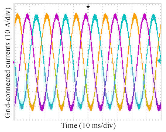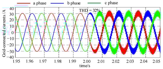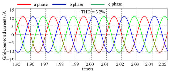 When the parameter of the capacitor current controller Kic changed, the resonant peak was significantly suppressed. As shown in Figure 19, this indicates that the grid-side current quality was improved obviously under the same harmonic excitation, and the THD of the grid-connected currents was just 3.2%. Therefore, the capacitor current controller can effectively suppress the resonant peak of an LCL-type VSG and its cluster.