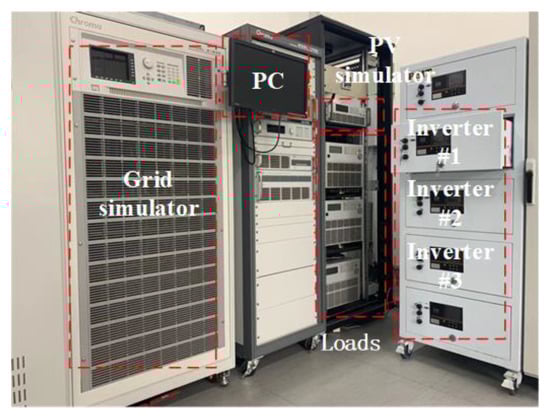 To further verify the above resonance characteristics analysis of a VSG based on the output impedance model, an experimental platform with three parallel VSGs was built in the laboratory, and the harmonic excitation was generated by a grid simulator. The experimental parameters were the same as the simulation parameters in Table 1. Figure 20 shows the experimental platform including a grid simulator (Chroma 61830) from Chroma Company (Taoyuan City, Taiwan), three grid-connected inverters, a PC, and three electronics loads. Other equipment included a digital signal processor (DSP TMS320F28335) from TI Company (Dallas, TX, USA), a current probe (CWTMini 3B) form PEM Company (Surrey, UK), and an oscilloscope (Tektronix MDO3024) from Tektronix Company (Beaverton, OR, USA). The configuration of the experiment used the grid simulator to generate three-phase voltages with high-frequency harmonics (2.3 kHz). Then, it used different control strategies to control the three VSGs in order to suppress the harmonics. As shown in Figure 21a, the current waveforms of a single VSG generated severe resonance in a polluted grid with 2.3 kHz harmonic voltage. In addition, for the three VSGs in parallel, the resonant frequency was shifted slightly to 2.25 kHz. When the 2.25 kHz harmonic excitation was injected into the grid, the system also generated resonance, as shown in Figure 21b.
