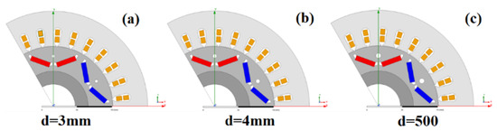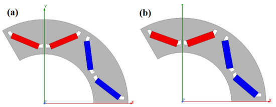 - Carraro, E.; Bianchi, N.; Zhang, S.; Koch, M. Design and performance comparison of fractional slot concentrated winding spoke type synchronous motor with different slot pole combinations. IEEE. Trans. Ind. Appl. 2018, 54, 2276–2284. [Google Scholar] [CrossRef]