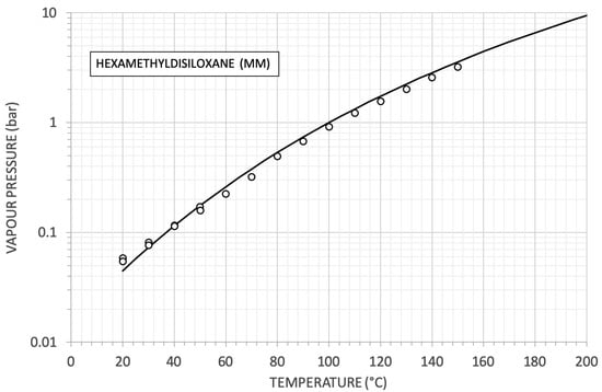 Vapour pressure of hexamethyldisiloxane (MM) as a function of temperature. The continuous line is from Aspen Plus v.9.0; the open circles are from our measured values.