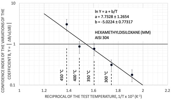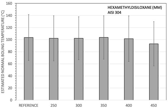 In the case considered here, a temperature in the range 350 to 400 can be considered to be a limit working temperature value for hexamethyldisiloxane (without significant contamination, in AISI 304), a result which is in accordance with the conclusion in []. Some other papers and publications suggest maximum working temperatures for siloxanes of 400 to 425 . On the other hand, according to [], samples of hexamethyldisiloxane in low carbon steel with air and probable humidity traces, decomposed substantially after about 312 h.