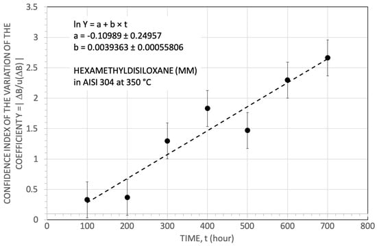 Relative variations (the confidence index) in the B coefficient in Equation (1) for a sample of hexamethyldisiloxane (MM) at 350 for time intervals of 100 each.
