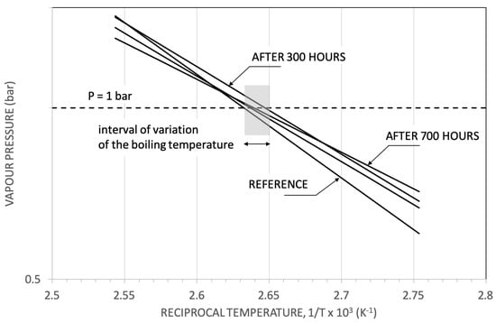 Therefore, we decided, after every temperature test, to consider only the variations in the vapour pressure near the atmospheric value, to estimate the variation of the normal boiling temperature and assume it represented an index of decomposition of the fluid. In this way, the misleading effects of the non-condensable gases were reduced. Only three values of vapour pressure were selected to estimate the normal boiling temperature (see Figure 3), and this, together with a relatively high temperature uncertainty (about one Celsius degree), unfortunately, introduced high uncertainties in its calculated values (see Figure 4 and Table 2), due to the high and on the coefficients B and A of the used equation