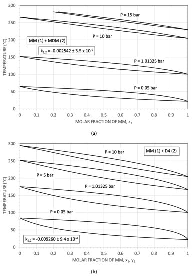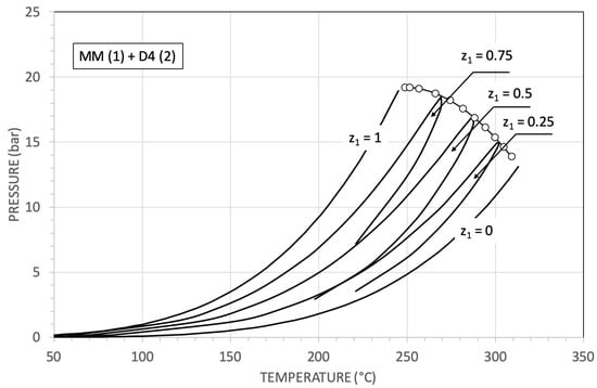 In [], bubble pressures for three mixtures of linear siloxanes with different compositions over a temperature range of 270 to 380 , were reported.