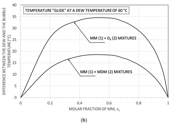 For example, in [], the authors analysed the performances of mixtures of and in Rankine cycles and estimated increases of 1–14 percent in the required heat transfer areas of the evaporator, according to the mixture composition, against obtaining an increase of only 1–2 points in the exergetic efficiency in a CHP configuration.