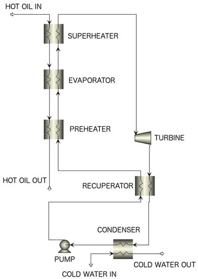 As constraints, we assumed a minimum condensation pressure of bar, in accordance with the design indications of typical commercial available biomass boilers (see, for example, [,]) and a temperature of the thermal oil after cooling equal to 250 .