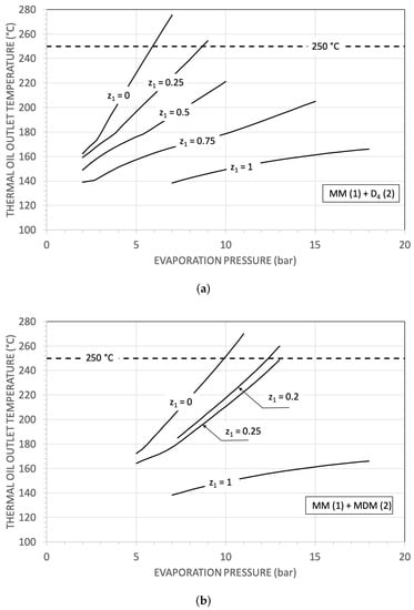 Thermal oil outlet temperature from the heat recovery heat exchanger as a function of the evaporation temperature and for different mixture compositions, for (a) a mixture of MM and and (b) a binary mixture of MM and MDM.