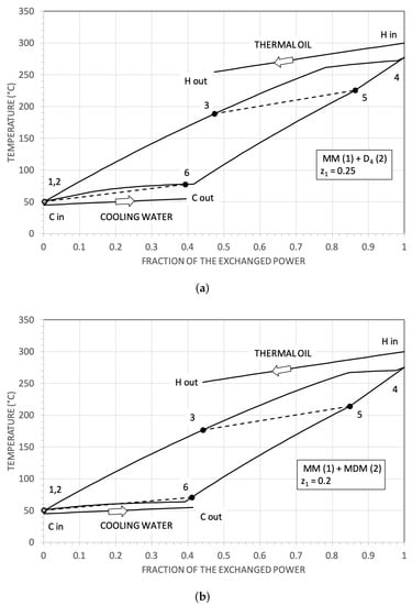 For the mixtures () and for (), the calculated efficiencies of the corresponding thermodynamic cycles were 0.253 and 0.264, respectively (Table 5). The two cycles, in a plane temperature–power, are shown in Figure 14.