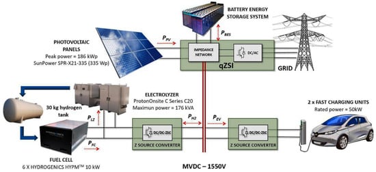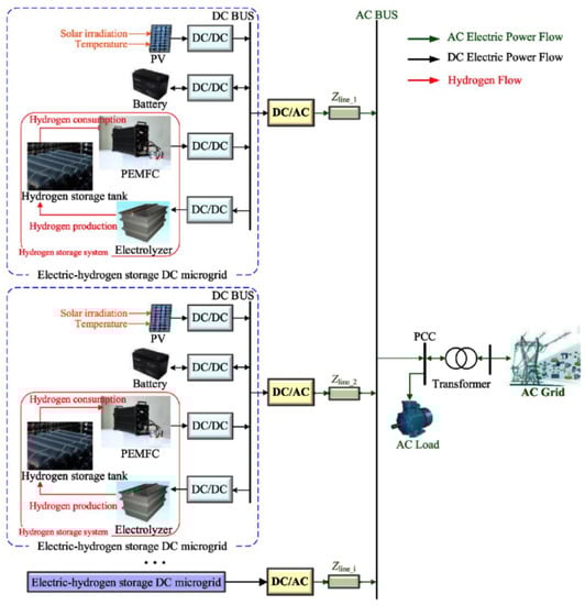 Power electronics include DC/DC and DC/AC converters, DC, and AC buses, which allow the microgrid to operate in both DC and AC modes, as needed [27]. The generated DC is typically converted to AC with a DC/AC inverter to satisfy the electrical loads of a building [17]. In an AC/DC microgrid, an internal DC link is connected on the AC side to connect the power generators and energy storage systems with a grid-side converter to constantly regulate bus voltage and frequency [29]. In addition, for building applications, a DC bus must be integrated between the hybrid PV-RHFC microgrid system and the electrical load of the building [42]. In the case of vehicle-to-grid applications, and since the output of an electric vehicle is DC power, this DC output must be converted to AC power with a DC/AC inverter installed in the conductive charging station [25]. An AC bus can be used to integrate the PV modules, battery storage units, electrolyzer, and auxiliary components with power electronics, in order to control the power flows [11].