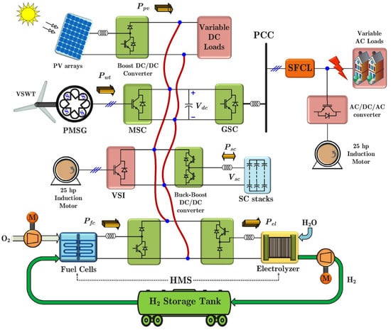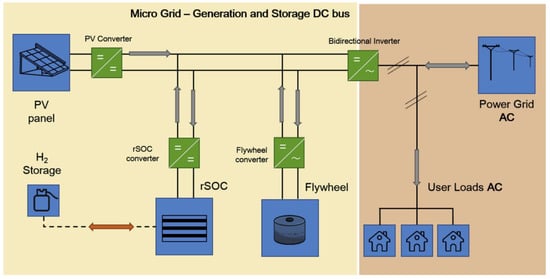 Schematic configuration of a hybrid PV-RHFC microgrid system coupled with a flywheel. Reprinted with permission from Ref. [20]. 2019, Elsevier.