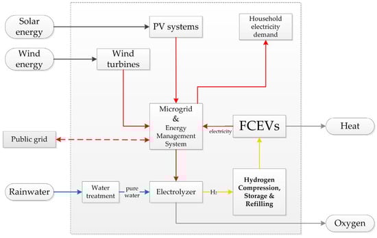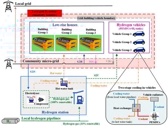 Schematic representation of a community microgrid with low-rise households, rooftop photovoltaics, fuel cell electric vehicles, and a hydrogen station. Reprinted with permission from Ref. [21]. 2021, Elsevier.