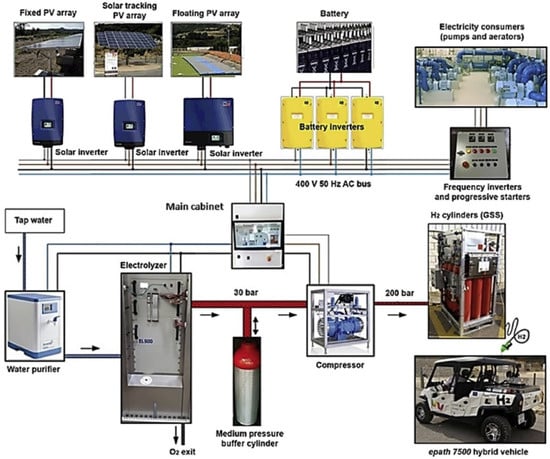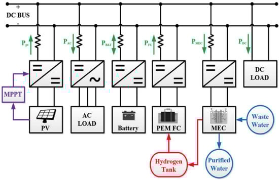 Schematic representation of an AC/DC PV-RHFC microgrid with wastewater treatment capability. Reprinted with permission from Ref. [44]. 2018, Elsevier.
