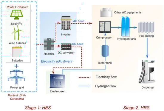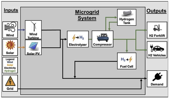 Schematic representation of a microgrid with onsite hydrogen refueling stations. Reprinted with permission from Ref. [46]. 2021, Elsevier.