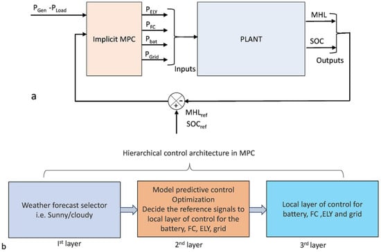 (a) Block diagram of a model predictive controller. (b) Hierarchical structure of the control system of a microgrid configuration. Reprinted with permission from Ref. [39]. 2021, Elsevier.