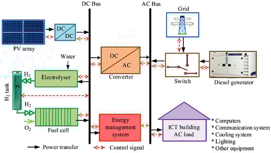 Flow diagram of a grid-connected PV-RHFC nanogrid for application in a university building. Reprinted with permission from Ref. [54]. 2021, Elsevier.