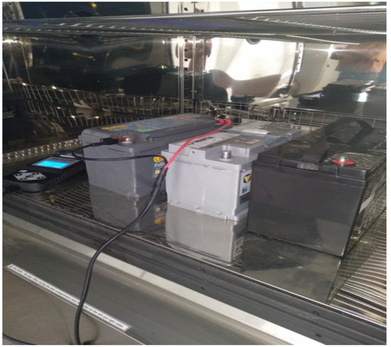Next, all the batteries were discharged with using a 10 A current for ten hours, for a 100 Ah battery. The discharge process was carried out for three temperatures (−20 °C, 25 °C and 50 °C) until the limit voltage set at 10.6 V was obtained. Taking into account the environmental requirements, the batteries were tested in an environmental chamber in the original housing (Figure 4), without any additional protective measures. In this work, the temperatures were selected based on those used during the testing of military equipment. These conditions are supposed to simulate harsh field conditions. The batteries were connected to the energy conversion block—the connector between photovoltaic system and energy storage. This module communicates with the power grid and the power generation block, ensuring proper charging and discharging of batteries. During the first step of the charging and discharging cycle, in the case of the VRLA battery type, some models were damaged and replaced with new ones, however, no statistical trends were observed in this matter. In all cases, the damaged batteries suffered from poor workmanship.