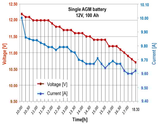 A typical current-voltage characteristic of the discharge process for all the battery types had very similar tendency: after a first drop of current, the following points registered during the process showed stable decrease as illustrated in Figure 5 for a single AGM battery.
