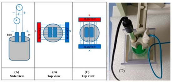 Schematic presentation of the deposition set-up: (A) without the EMF (side view); (B) perpendicular orientation of the EMF (top view); (C) parallel orientation of the EMF (top view), in respect to the surface plane, and photo of deposition set-up (D).