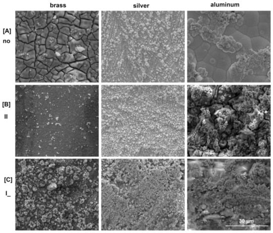 Changes in the EMF appearance and its location (perpendicular and parallel) lead to modifications of the film’s composition (Figure 5). A decrease (brass, silver) or an increase (aluminum) of Fe content is observed without magnetic field assistance. In the case of Al, the inversion of the iron content takes place after the magnetic field application, regardless of perpendicular or parallel orientation. The anomalous co-deposition, characterized by a higher content of a less noble metal in the deposit than in the electrolyte, changes and disappears under the influence of an external magnetic field (parallel and perpendicular). The use of EMF reduces the percentage of iron in the alloy to the value resulting from the Ni:Fe ions ratio in the electrolyte. There were no visible changes in the iron content in the alloy film obtained on the silver substrate in comparison to the one on the aluminum substrate. After the application of a brass substrate, the iron percentage changes in another way than it has for the Al substrate. Composition changes are the most noticeable in the case of an external magnetic field arranged perpendicularly to the electrode surface. Both diamagnetic substrates (silver, brass) had a similar effect on the resulting FeNi layer. The diamagnetic nature of the substrates on which the layer (FeNi) is deposited results in a weak reaction or no reaction (morphology, composition) to the external magnetic field applied. These results are clearly shown in Figure 5 and are in agreement with the published data [,,]. The choice of substrate has an impact on the average film thickness. From Figure 5, it is clear that the thinnest FeNi layer was obtained on the Ag substrate. The results also reflect an influence of the EMF arrangement on the film’s thickness. Based on this study, a clear correlation between the crystal structure and the external magnetic field presence, its orientation, and distribution was demonstrated. In the case of all considered substrates, the greatest thickness of the FeNi layer was obtained in the case of deposition without the presence of an external magnetic field and the thickness decreased after the application of the EMF regardless its orientation (Figure 5).