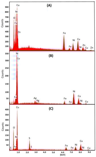 An example EDX spectra of the deposited FeNi films on different substrates (A) brass, (B) silver, and (C) aluminum, in the presence of II external magnetic field orientation in respect to surface plane.