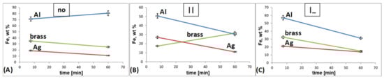 Time influence on the Fe content in the FeNi alloy deposited on different substrates, current density—50.0 mA/cm2: (A) without EMF, (B) parallel EMF, (C) perpendicular EMF.