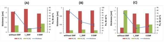 EMF influence on the Fe and Ni content in the FeNi alloy (blocks, right side) and on its thickness (line, left side); substrates: (A) brass, (B) silver, (C) aluminum, current density 50.0 mA/cm2, time of deposition—3600 s.