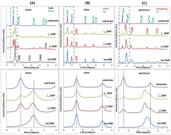 The crystalline structures of the FeNi alloys deposited on different substrates and in the external magnetic field (EMF) presence are shown in Figure 6. Here, the full range of measurements (upper row), as well as a focused view around the most intense peaks (lower row), are depicted. XRD patterns change as a result of applying three kinds of substrates of the same crystallographic structure. To the presented diffractograms, proper Miller indices (hkl) were assigned typical for substrates (metallic Ag, Al, and CuZn) and the crystal structures of the studied alloys (FeNi or FeNi3) [,]. Electrodeposition of FeNi films on brass without the EMF application results in growth that is typical for FeNi crystal structure. Both settings of the EMF result in the mixture of a pattern typical for the substrate and FeNi alloy that is correlated to the reduced film thickness (Figure 5) [,,,,]. For the Ag substrate in all considered cases (with or without the EMF), the obtained layers were almost five times thinner than film obtained on the other substrates (brass, aluminum—Figure 5). The thickness remained in correlation with the analyzed diffractograms (Figure 6) and affected the electrodeposited film very strongly (its crystal structure). The absence of the FeNi or FeNi3 peaks is the result of the dominant occurrence of an amorphous structure [,,,,]. Diffractograms registered for FeNi film deposited on the aluminum substrate support the following conclusions: (i) electrodeposition without EMF yields a crystal structure typical for FeNi or FeNi3 (however, due to elemental composition, FeNi3 is less favorable but due to line width mixture cannot be neglected); (ii) the application of an external magnetic field caused the thinner FeNi film growth. It also had a visible effect on increasing the nickel content in the percentage composition of the formed FeNi layer (toward FeNi3) and caused a drastic decrease in its thickness (similar to the case of the silver substrate)—Figure 4. The film composition and its crystal structure are very similar regardless of EMF orientation. For the diffractograms collected in Figure 5, the basic parameters of the films crystal structures were estimated. The average diffracting zone and thereby the crystallites’ size, Dhkl, was calculated according to Scherrer’s formula [,,,,].