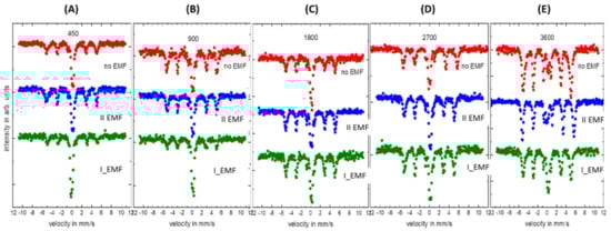 Mössbauer spectra of the FeNi alloys on aluminium substrate: (A) 450 s, (B) 900 s, (C) 1800 s, (D) 2700 s, (E) 3600 s.