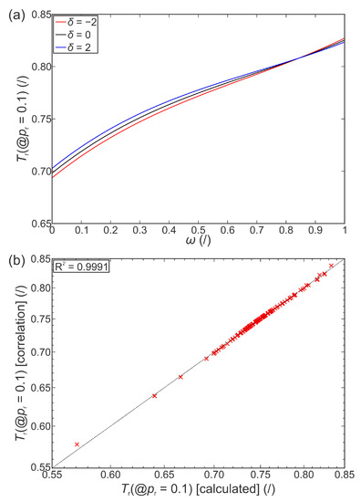 ω and δ define the corresponding equation of state (EoS). These parameters are given in [17] for over 100 fluids. From the viewpoint of the corresponding-states principle, the choice of reduced temperatures is better than that of reduced pressures, since the additional parameters of the corresponding EoS are defined at a constant reduced temperature. As can be seen from Figure 1a, at constant pressure, e.g., at pr = 0.1, the reduced temperature will change, depending on additional parameters ω and δ. The dependence of Tr @ pr = 0.1 on ω and δ is given from the EoS in the following equation, the coefficients of which (a1 to a6) are provided in Table 1: