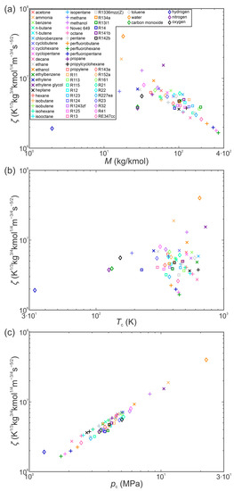 Evaluation of the zeta function at terrestrial gravity for 64 fluids. (a) Dependence on molar mass, (b) dependence on critical temperature and (c) dependence on critical pressure.