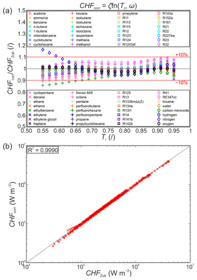 (a) Ratio between the CHF values determined by the second proposed correlation (Equation (22); accounting for ω and δ) and CHF values determined through the Kutateladze–Zuber correlation for 64 fluids in the reduced temperature range between 0.55 and 0.95. (b) Comparison of CHF values determined through the Kutateladze–Zuber prediction and the second proposed correlation.