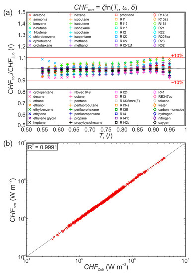 An evaluation of the CHF correlation defined through Equation (21) is shown in Figure 4a, where the ratio between the CHF predicted by Equation (21) and calculation using the Kutateladze–Zuber equation [Equation (1) with K = 0.131] is shown for 64 fluids in the reduced temperature range between 0.55 and 0.95.