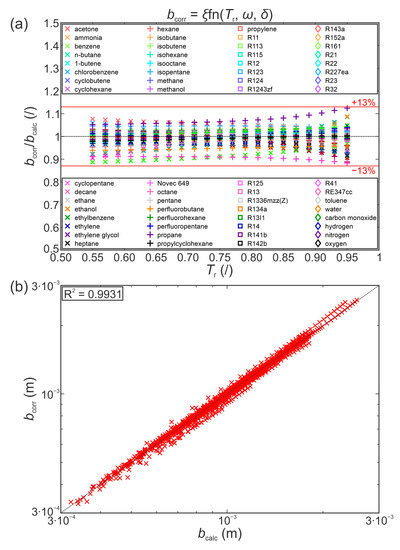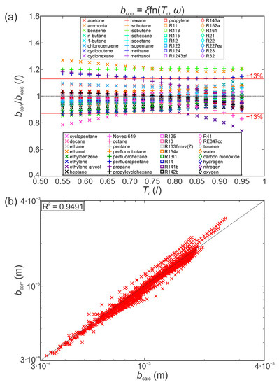 (a) Ratio between the capillary length determined by the first proposed correlation (Equation (25); only accounting for ω) and calculated capillary length values for 64 fluids in the reduced temperature range between 0.55 and 0.95. (b) Comparison of capillary length values determined through calculation and by using the first proposed correlation.