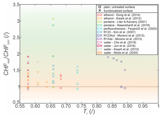 Values predicted by the second CHF correlation [Equation (22)] were compared to experimentally determined values for different fluids at different reduced temperatures. Specifically, data for ethanol [22,23], pentane [24,25], perfluorohexane [26], R123 [27], R1234yf [28], R134a [28], and water [29,30,31,32] was sourced from literature. The results are shown in Figure 8. CHF values measured on plain (untreated) surfaces are compared to values measured on functionalized surfaces, prepared using one or more surface modification techniques, which were all shown to enhance the CHF value.