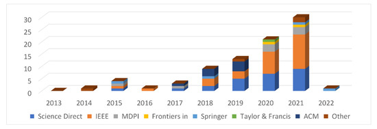 Figure 2 presents the articles that were selected for inclusion in this review, organized by the publisher and publication year. A steady growth in publication activity is observed. This figure, and all the other charts in this paper, are based on manually selected articles and metadata that was collected from them. The metadata includes the publisher, year of publication, country of affiliation of the first author, as well as a 3-tier categorization that is described next.
