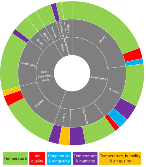 Two articles were found in which both binary and discrete control of various HVAC devices was used to control temperature, humidity and air quality. In the first article, a total of N discrete temperature setpoints are available to the RL agent, as well as a binary control action to turn the ventilation on/off, resulting in an action space with 2N actions [114]. In the second article, an RL agent controls the window opening, ventilation and awning. The awning supports binary control, the window supports 3 discrete setpoints and the ventilation supports 4 discrete setpoints. This results in 2 × 3 × 4 = 24 possible combinations, but the authors manually excluded undesirable combinations, resulting in a total of 10 combinations, so the action space consists of these 10 options [115].