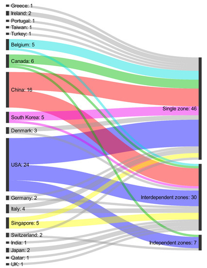 Figure 5 presents a Sankey chart, in which the bar on the left is the country of affiliation of the first author, and the bar to the right is the Tier 1 category under which the article was categorized. The width of each flow is proportional to the number of articles that authors in the country on the left hand side of the flow contributed to the category on the right hand side of the flow.