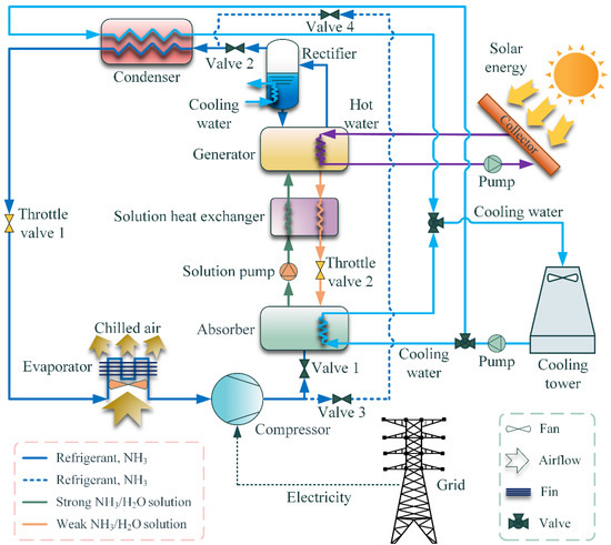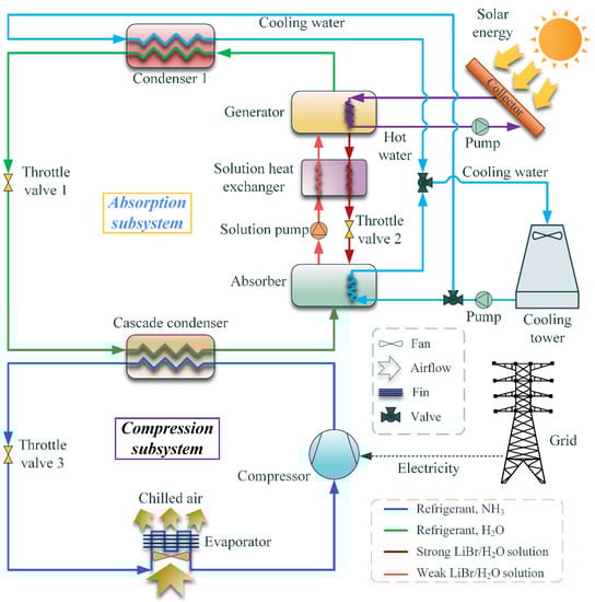2]. Consequently, the reduction in refrigeration consumption is essential, especially under the background of carbon neutralization. Solar cooling technologies are promising to reduce the consumption of refrigeration systems, because solar energy is clean, abundant, and coincident to the cooling demand. Among various solar cooling technologies, solar-assisted hybrid cooling systems based on the absorption–compression-integrated cycle serve as the potential solution in replacing traditional electric-driven chillers, owing to the consideration of performance and reliability.