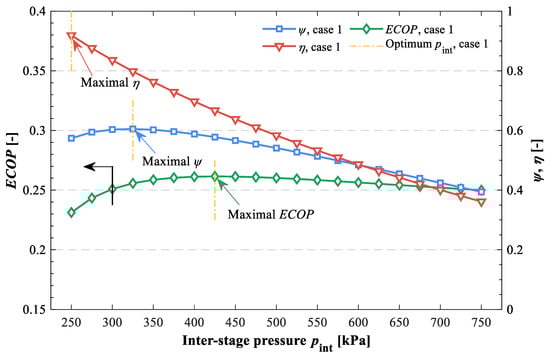 Effect of inter-stage pressure on performance indicators for two-stage cycle with thermal and mechanical compression processes in case 1.