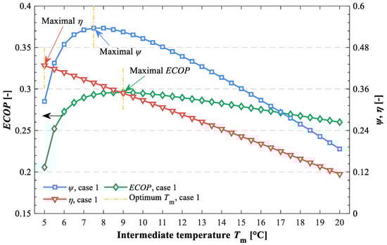 Effect of intermediate temperature on performance indicators for the layout with a cascade subcooling process in case 1.