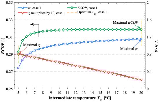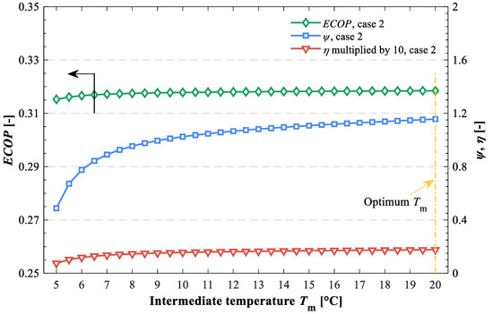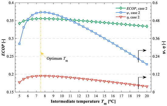 Effect of intermediate temperature on performance indicators for the layout with a cascade subcooling process in case 2.