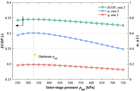 Effect of inter-stage pressure on performance indicators for two-stage cycle with thermal and mechanical compression processes in case 2.