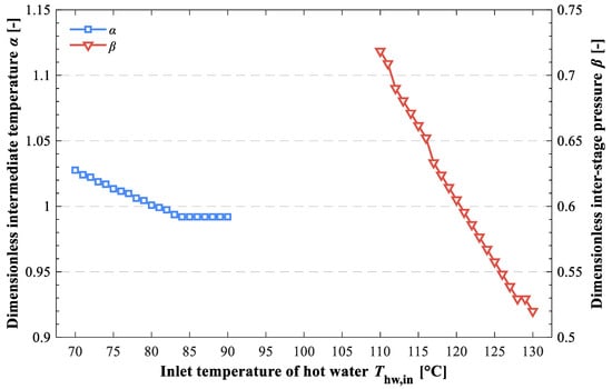 Effect of inlet temperature of hot water on dimensionless optimum intermediate temperature and inter-stage pressure.