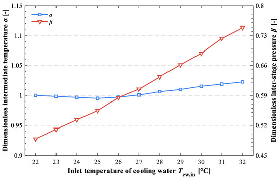 Effect of inlet temperature of cooling water on dimensionless optimum intermediate temperature and inter-stage pressure.