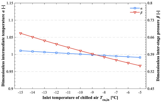 Effect of inlet temperature of chilled air on dimensionless optimum intermediate temperature and inter-stage pressure.