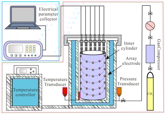 Electrical resistivity tomography (ERT) is an imaging technique to establish the resistivity image by calculating the resistivity distribution within an object [24,25,26]. An electrode array is used to acquire the electrical signal around the object which is used to calculate the resistivity. As a non-destructive and non-invasive detection method, ERT has been applied to monitor the distribution of hydrate in the laboratory. Walsh preliminarily verified that ERT could identify the hydrate formation without sediments [27]. Priegnitz et al. carried out the hydrate formation and dissociation in sediments to reveal the spatial distribution of pore-filling hydrate and characterize core electrical properties [28,29]. Li et al. utilized ERT to monitor hydrate’s formation position and heterogeneity. They found that the formation position and heterogeneity of hydrate are controlled by the distribution of pore water and methane gas [30]. Liu et al. developed a cross-borehole electrical resistivity tomography array to monitor the dynamic evolution of hydrate-bearing sediments [31]. However, most of these researches are aimed at pore-filling hydrate, and the application of ERT in fracture-filling hydrate has been rarely reported.