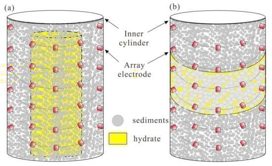 The electrodes are in direct contact with sediments. To prevent hydrate from wrapping the electrodes during the formation of hydrate, pure hydrate in fracture (massive hydrate) and hydrate in sandy sediments bedded in fine-grained sediments (layered hydrate) are synthesized (Figure 2). Meanwhile, these two morphologies of fracture-filling hydrate are similar to natural conditions where natural gas hydrate reservoirs develop.
