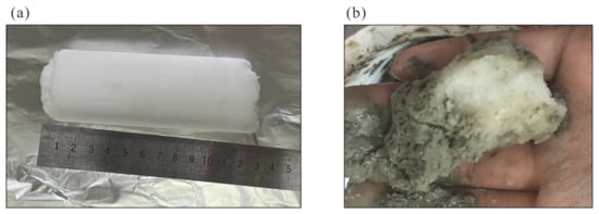 Massive hydrate is formed by using cylindrical ice powder. Ice powder formed from distilled water is made into a cylinder with a diameter of 4.0 cm and a height of approximately 13.0 cm (Figure 3a). The cylindrical ice powder is put into liquid nitrogen to keep the ice powder from melting. Then, it is buried in fine-grained sediments with particle sizes from 0.02 μm to 62.5 μm, which are cooled in advance to avoid melting ice powder. To simulate the marine environment, the salinity of pore fluid in fine-grained sediments is approximately 3.5 wt%, and the saturation is 100%. Methane gas (purity > 99.99%) is injected into the vessel to reach high pressure. The temperature in the vessel is reduced to −2 °C at first. Then, the temperature is raised slowly. The experiment lasted for 440 h to ensure that the ice powder was converted into massive hydrate (Figure 3b). The experiments of massive hydrate have been repeated three times.