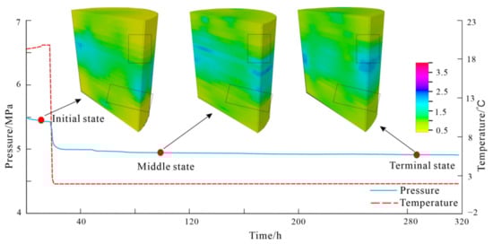 Figure 4 shows the three-dimensional resistivity image of the massive hydrate, clearly identifying the massive hydrate in fine-grained sediments. In the initial state, the resistivity of ice powder is about 8 , and the resistivity of fine-grained sediments is about 1 . After 40 h, the resistivity of ice powder is greater than 100 , and the resistivity of sediments is about 13 . It is obvious that the resistivity of fracture-filling hydrate sediments increases rapidly with the formation of hydrate. This phenomenon agrees well with the others’ results [35,36].